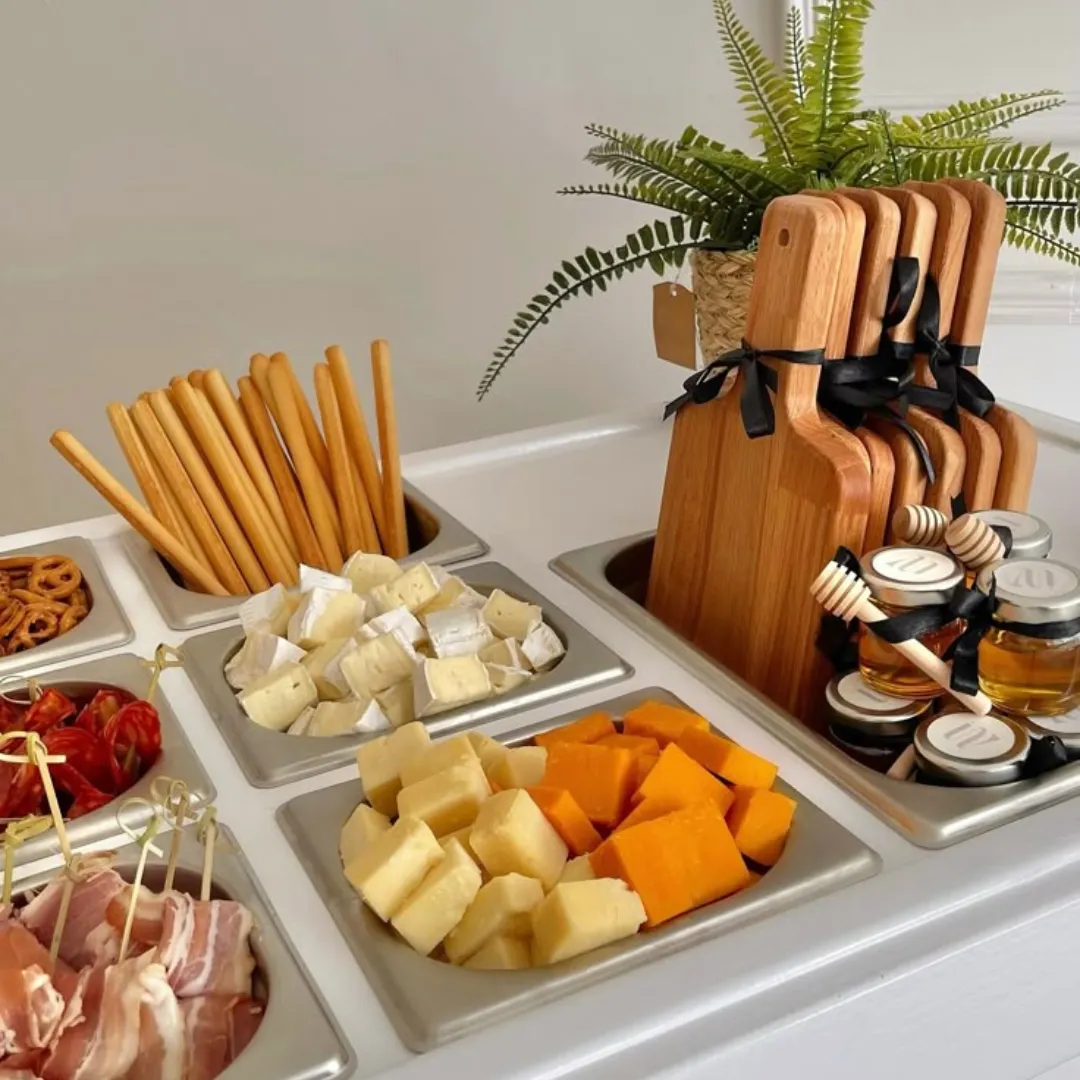 Easy roll in and set up. Our cart includes charcuterie styling, décor, utensils, eco-friendly serveware, and signage tailored to your event theme. Requirements for our set up depend on whether it's a public or private event. We can usually get set up in less than hour for most events.