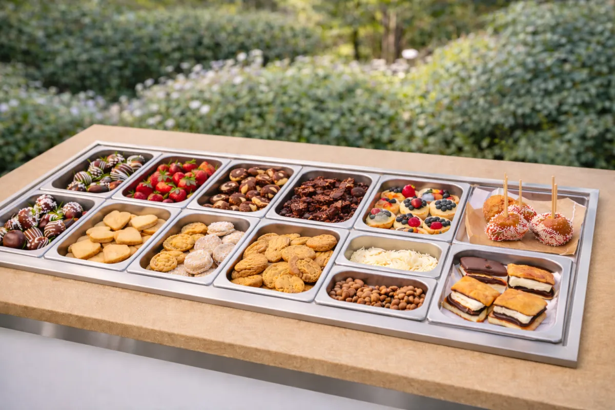 A sugar-kissed lineup of chocolate-covered fruit, nuts, brownie bites, cookies, mini treats.