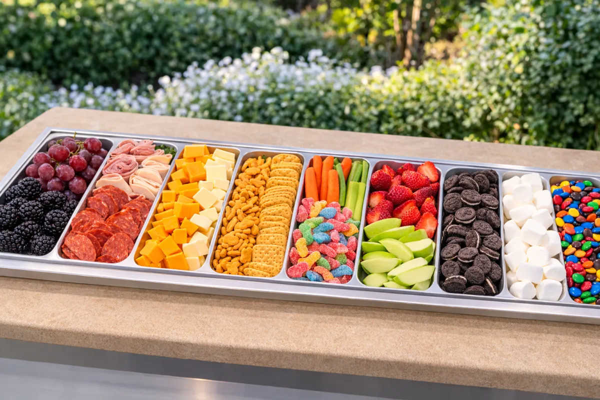 Kid events just got an upgrade! This menu features kid favorite snacks, cheese, crackers. sour patch candies, veggie sticks, fresh fruits and more!